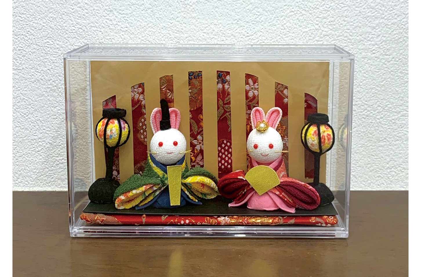 つまみ細工でかわいらしいうさぎのひな人形を作ります。ちりめんの上品な風合いとやさしい色彩が空間を華やかに彩ります。節句のお祝いにもぴったりです。基本のつまみ方のみで仕上げるので、初めての方もどうぞ。屏風は薄茶・黒・桃色から選べます。